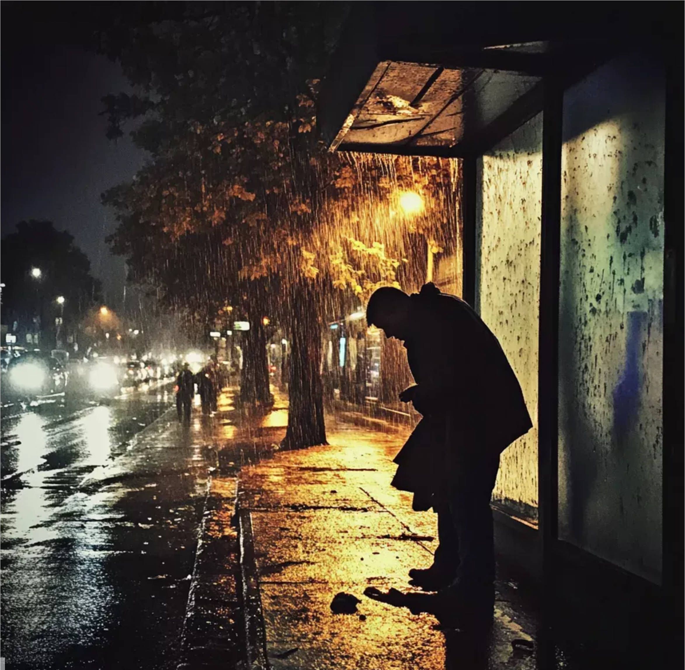 Na zchátralé autobusové zastávce stál promoklý a třesoucí se muž v roztrhané bundě, která obepínala jeho hubenou postavu. Vypadal, jako by se mohl každou chvíli zhroutit.