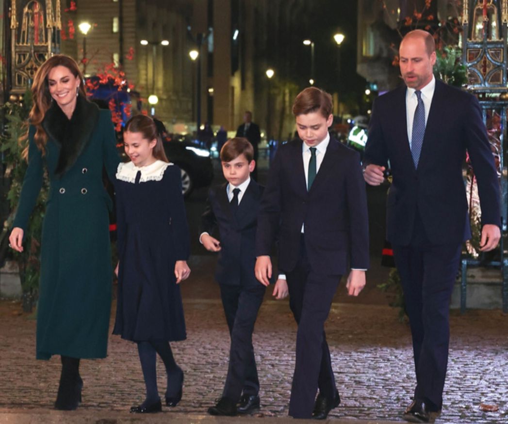 Členové rodiny obdivovali slavnostní světelnou výzdobu před bohoslužbou, která bude vysílána v televizi na Štědrý den. Uvnitř princezna z Walesu pomohla Louisovi držet svíčku, zatímco druhou rukou držela podnos s občerstvením.