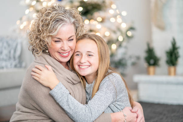 A beautiful caucasian mother and daughter share a cuddle hug. They are both smiling and full of love.