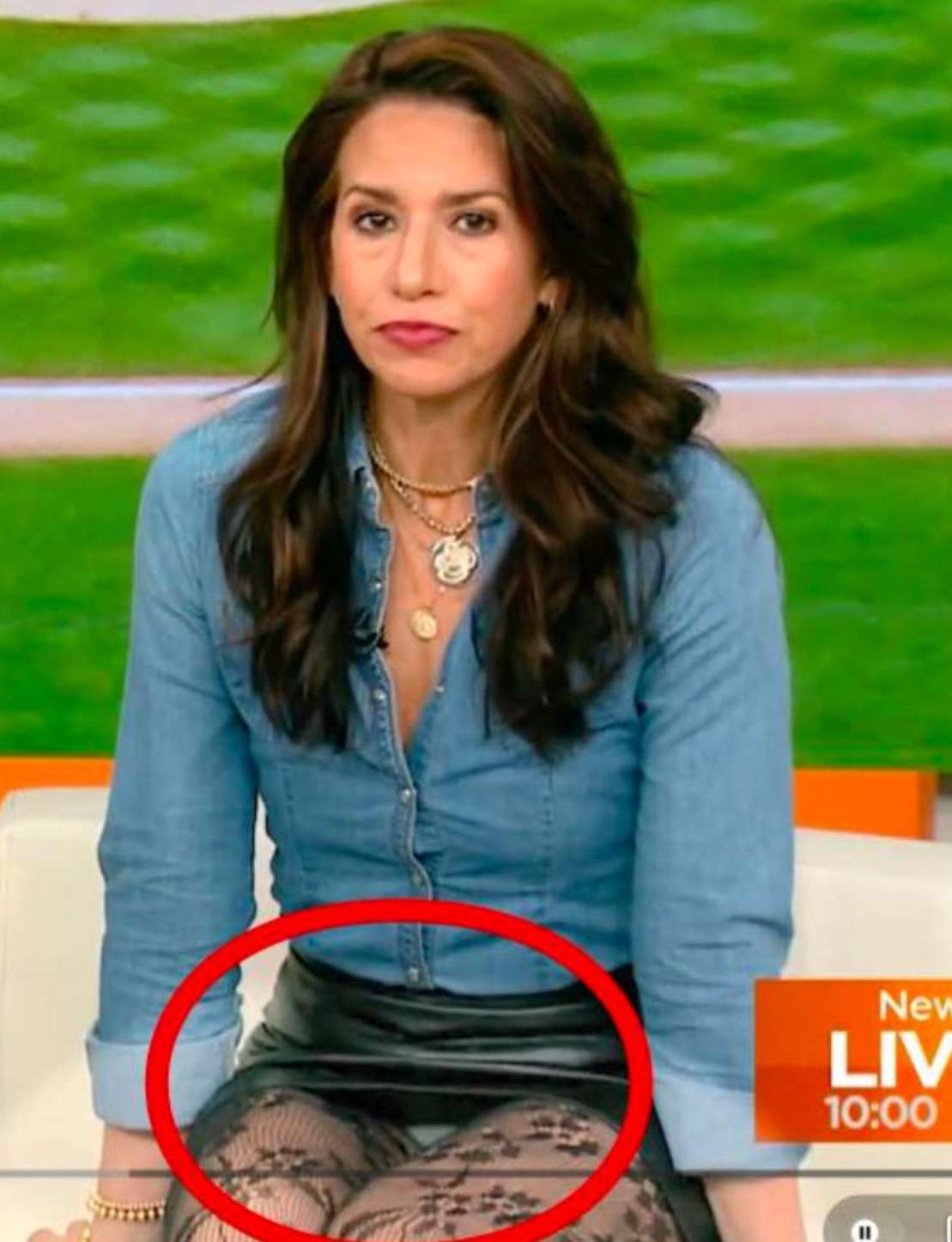 Uprostřed televizního studia sedí žena v zářivě žlutém křesle.