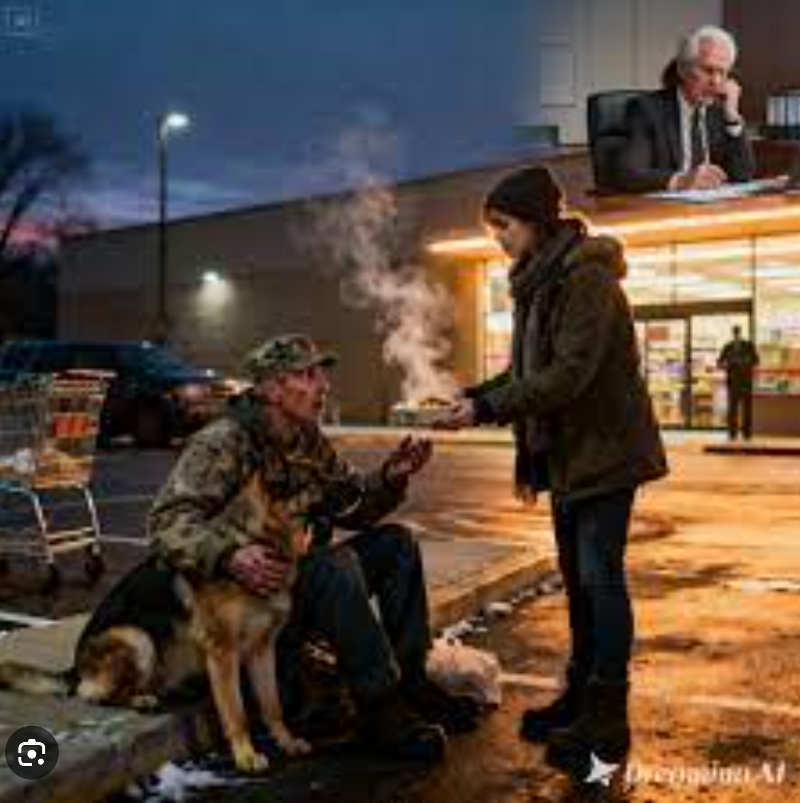 Spěchala jsem domů za svými dětmi po dalším dlouhém dni v pojišťovně, když jsem si všimla hladového veterána a jeho věrného psa, jak sedí v chladu. Koupila jsem jim teplou večeři a dál na to nemyslela… až do chvíle, kdy mě o měsíc později můj rozzuřený šéf zavolal do své kanceláře a řekl: